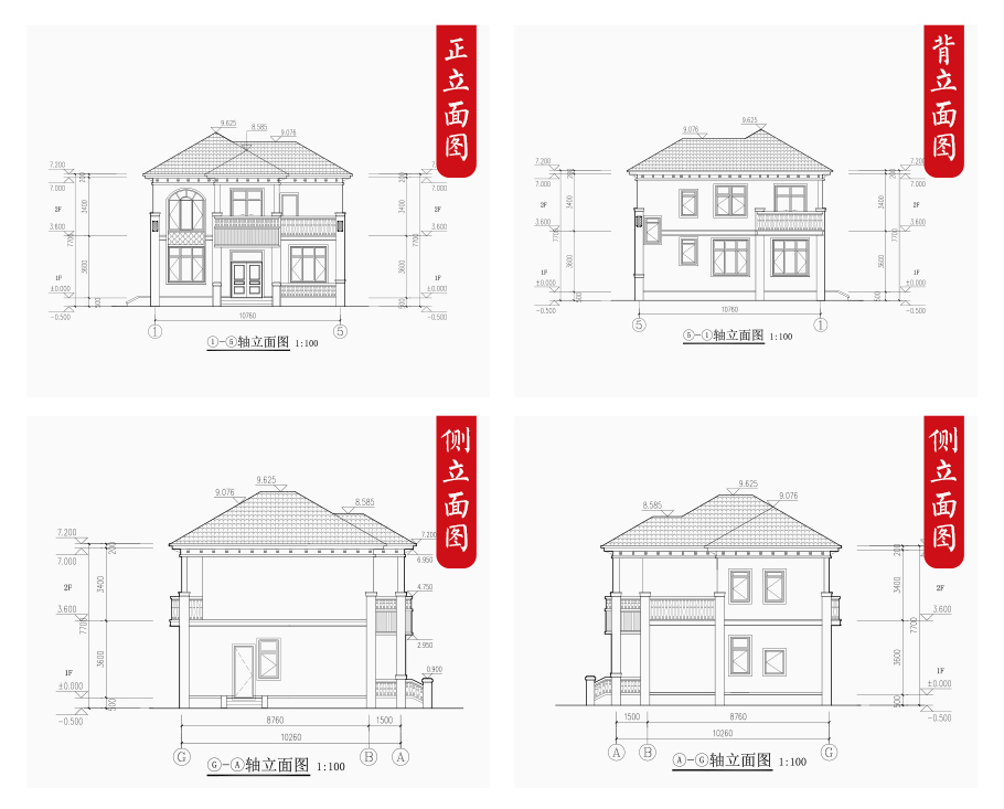 建筑立面圖:東立面圖,西立面圖,南立面圖,北立面圖,剖面圖;