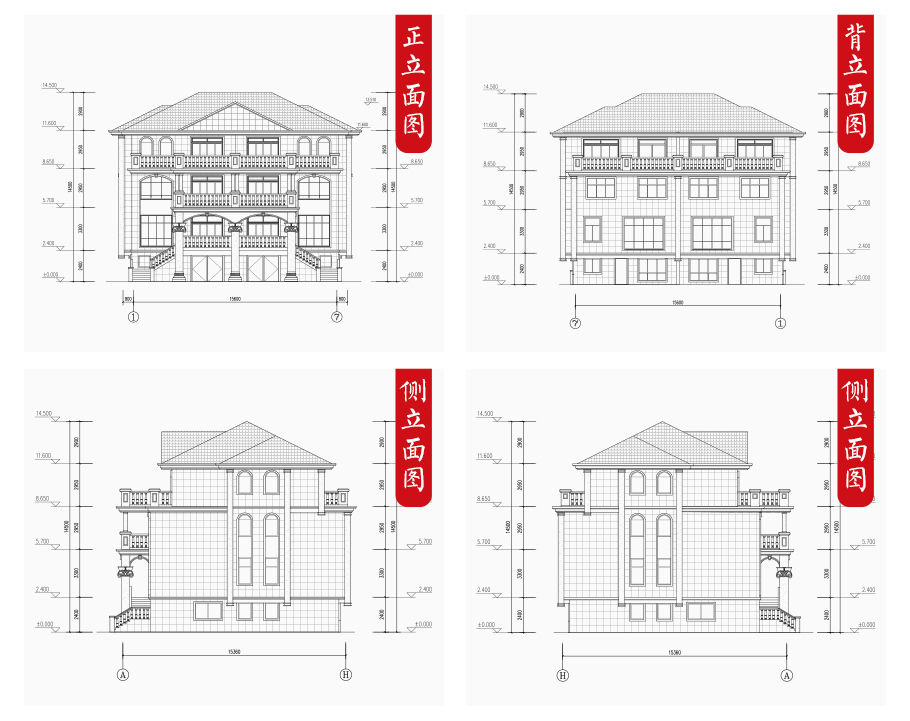 建筑立面圖:東立面圖,西立面圖,南立面圖,北立面圖,剖面圖;