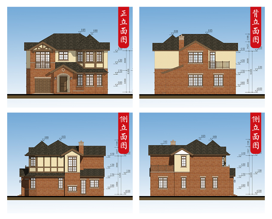 建筑立面圖:東立面圖,西立面圖,南立面圖,北立面圖,剖面圖;