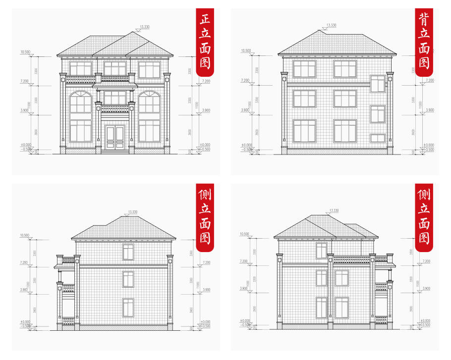 建筑立面圖:東立面圖,西立面圖,南立面圖,北立面圖,剖面圖;