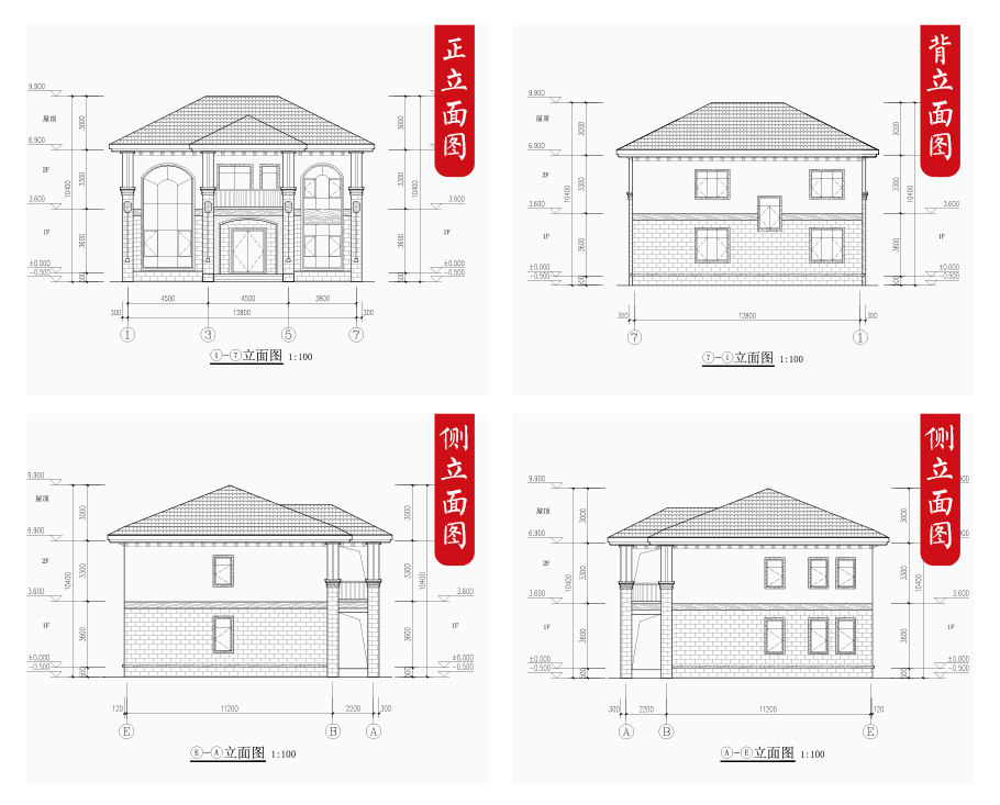 建筑立面圖:東立面圖,西立面圖,南立面圖,北立面圖,剖面圖;