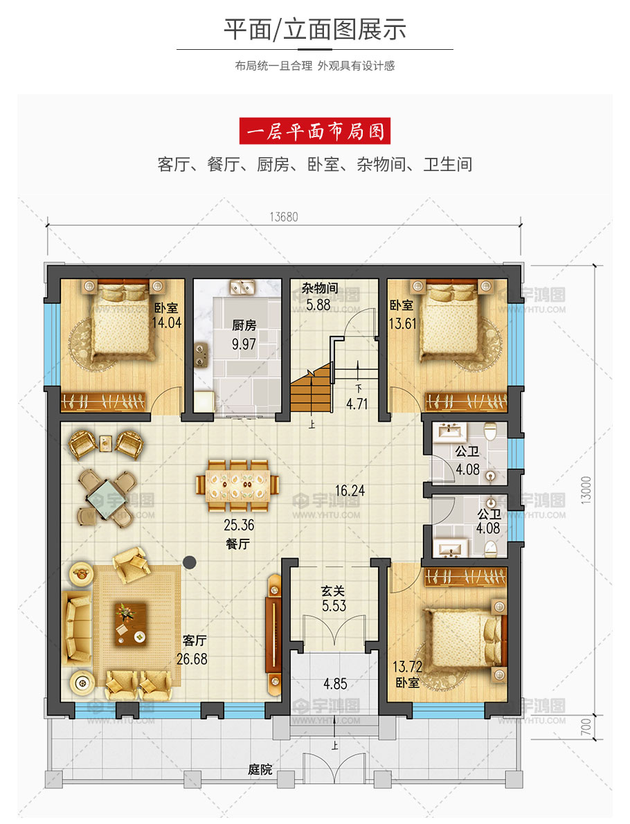 | 開間:13.68米 | 進深:13.7米 | 占地面積:173平方米 | 建筑面積:354.3平方米 |