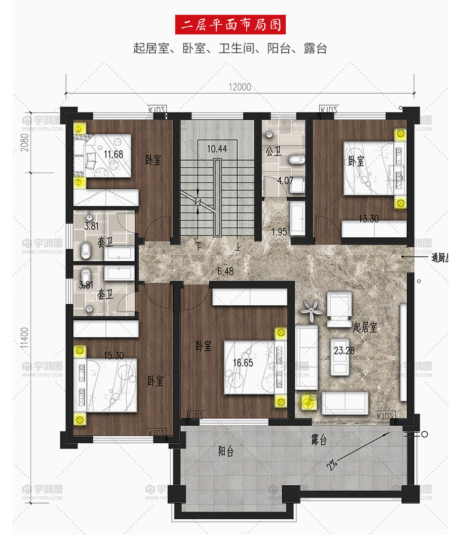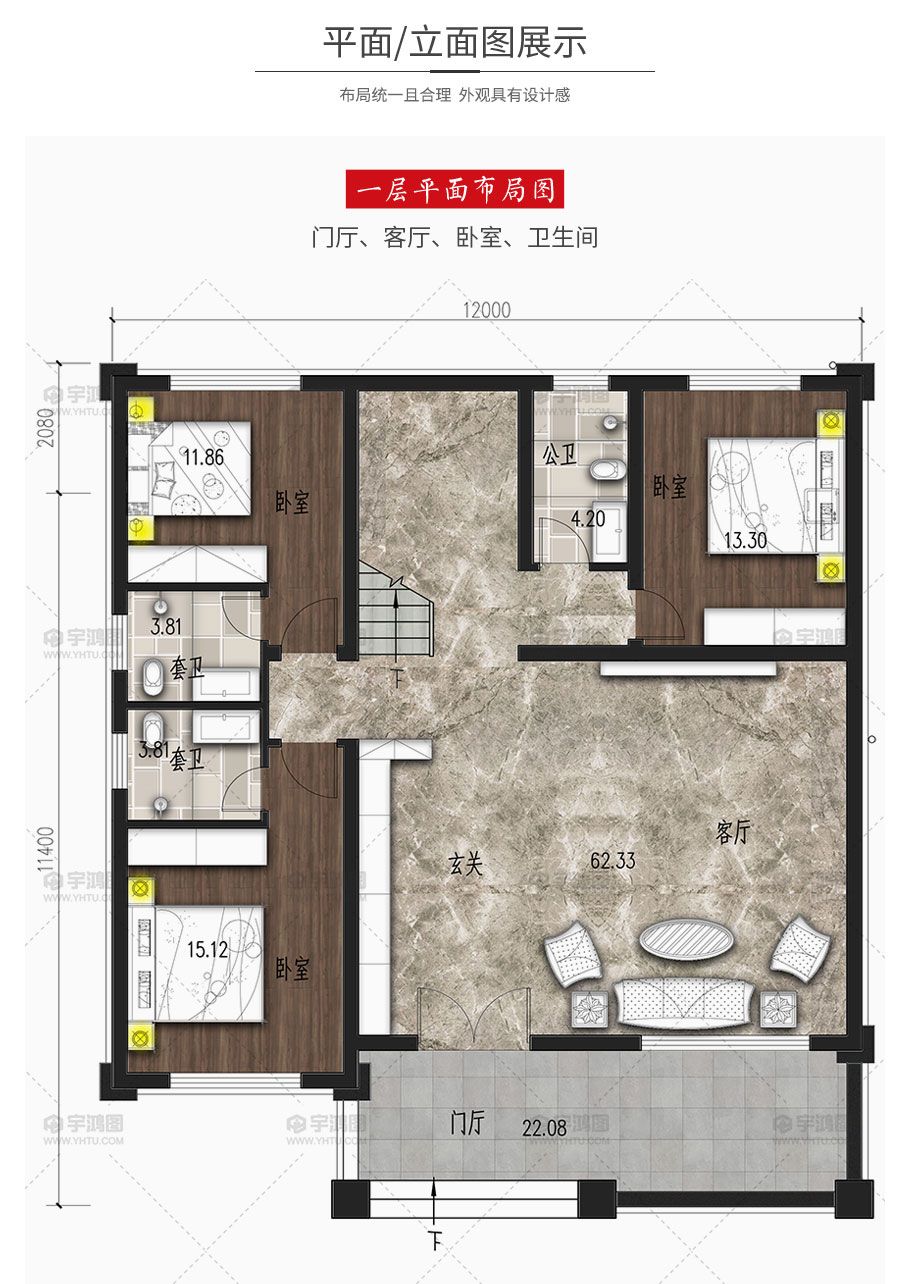 | 開間:12米 | 進深:13.68米 | 占地面積:132平方米 | 建筑面積:360.6平方米 |