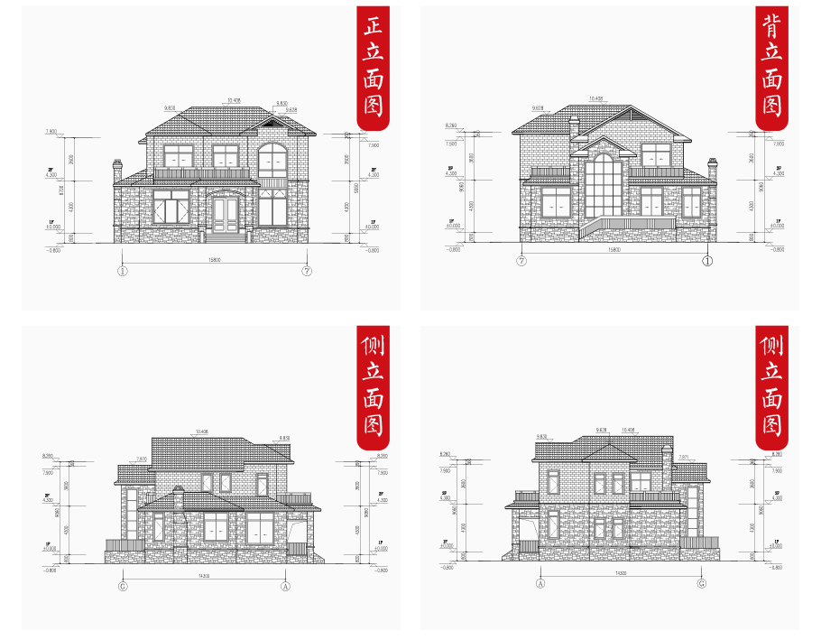 | 建筑圖: | 建筑平面圖:一層平面圖,二層平面圖; 建筑立面圖:東立面圖,西立面圖,南立面圖,北立面圖,剖面圖; 大樣圖:樓梯詳圖,細部大樣,門窗大樣 |