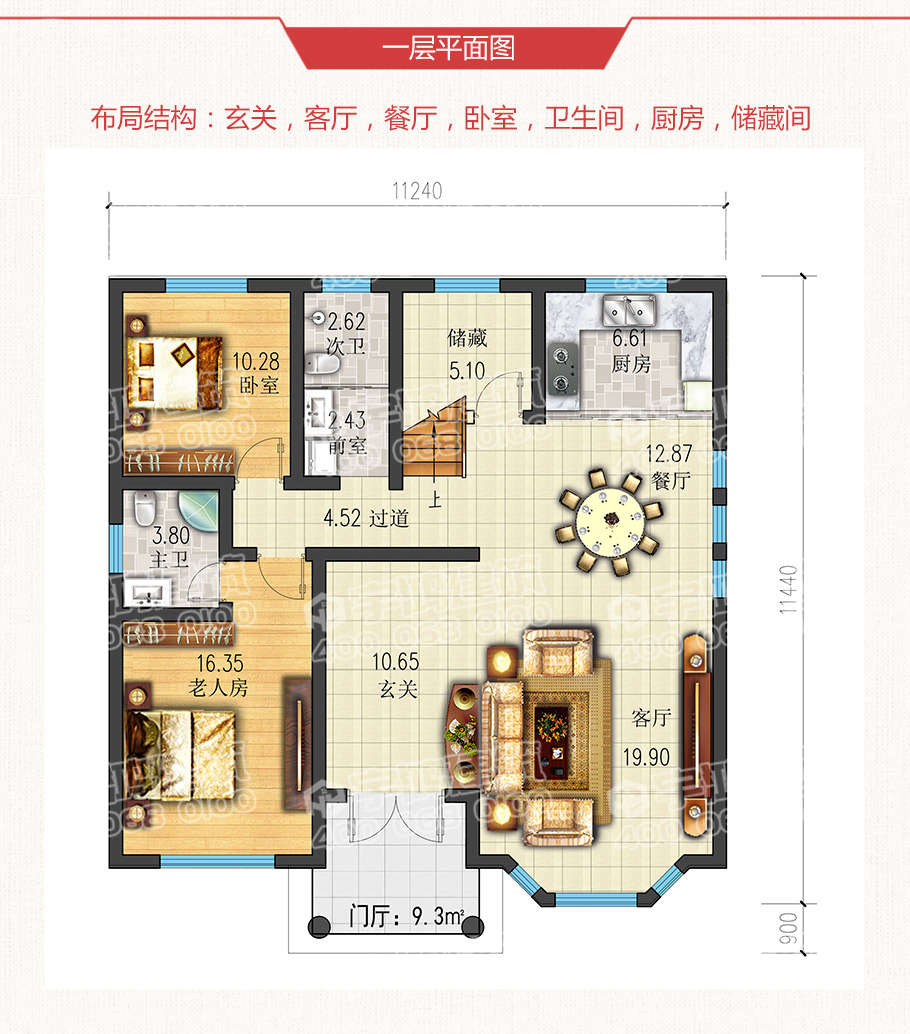 11x12米復式三層農村別墅設計圖紙,本戶型為復式三層經典農村自建別墅設計圖,參考造價25萬左右。經典耐看,不容易過時,也不會落伍。墻面用黃色和乳白色真石漆裝飾,紅色屋頂清新脫俗,寬闊的落地大玻璃格外顯眼,戶型布局合理。一層進門右手邊是客廳,左手邊設有一間主臥帶有內衛,可根據家庭需求設為老人房。廚房和餐廳融為一體非常方便。
