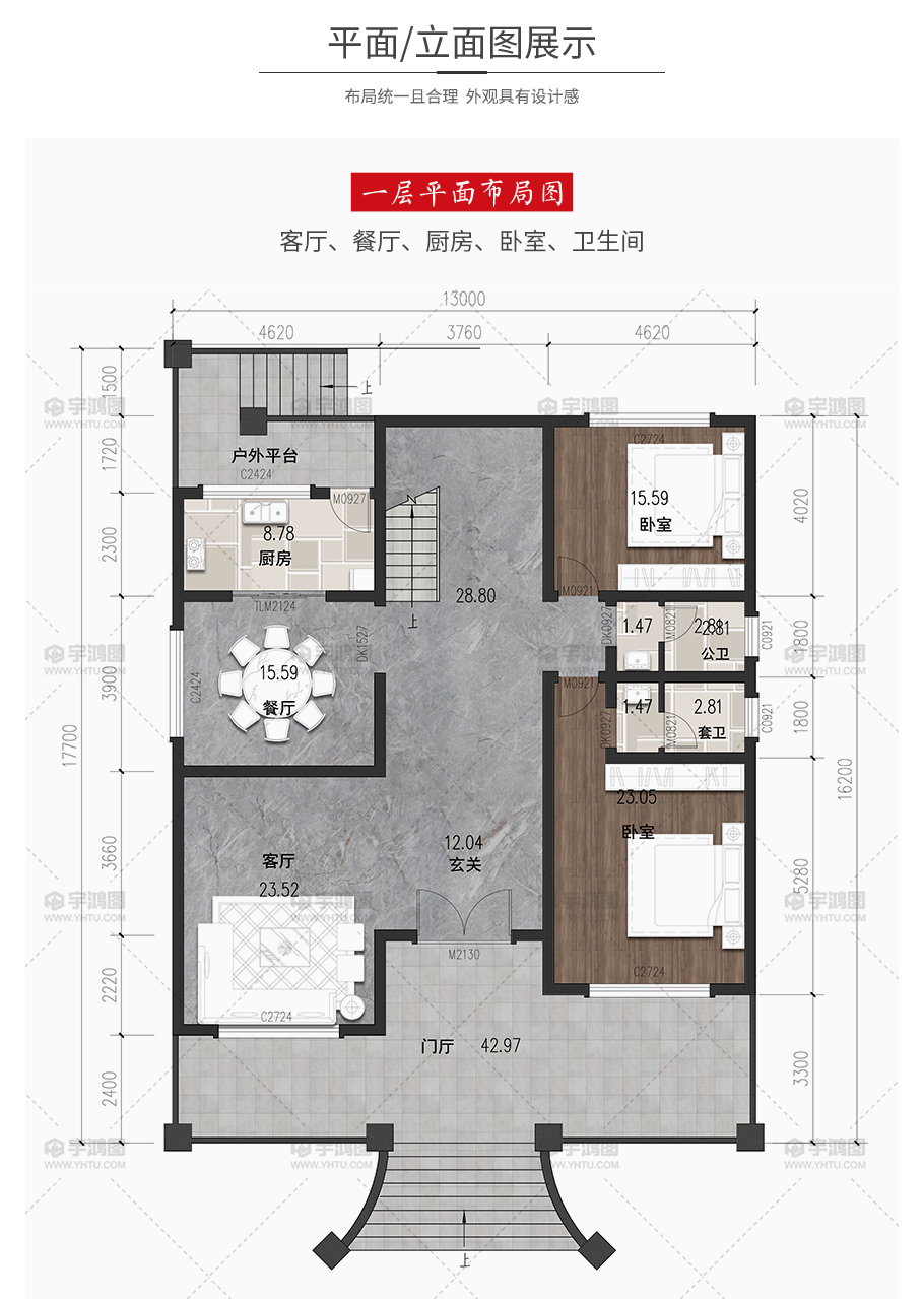 | 開間:13米 | 進深:16.2米 | 占地面積:212.32平方米 | 建筑面積:311平方米 |
