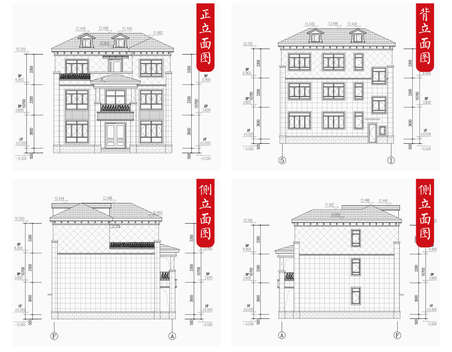 建筑立面圖:東立面圖,西立面圖,南立面圖,北立面圖,剖面圖;