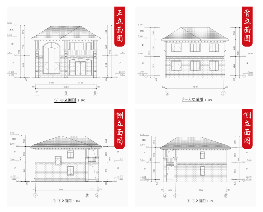 建筑立面圖:東立面圖,西立面圖,南立面圖,北立面圖,剖面圖;