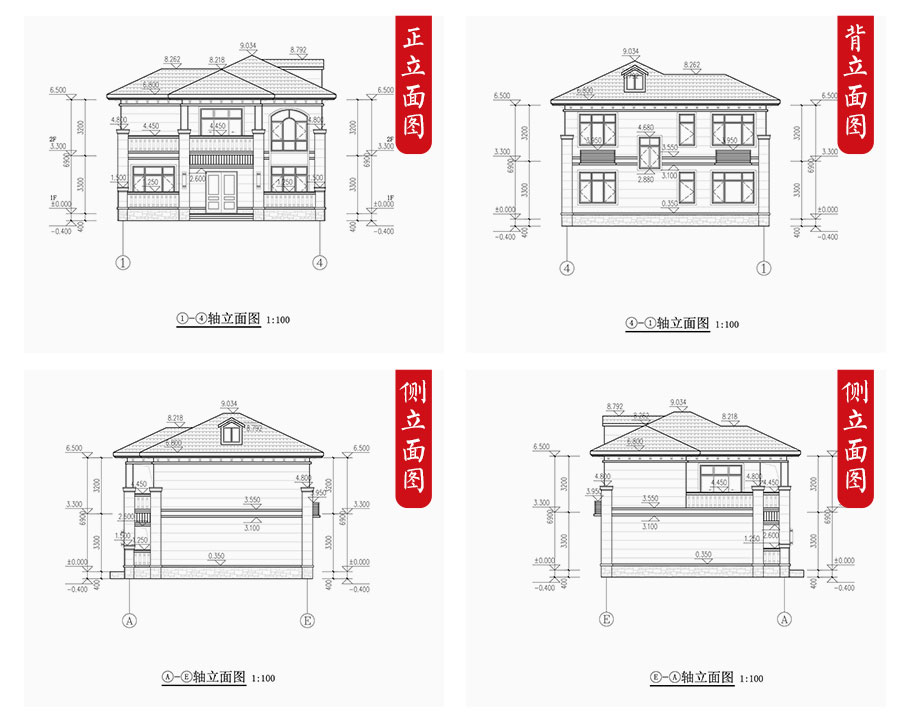 建筑立面圖:東立面圖,西立面圖,南立面圖,北立面圖,剖面圖;