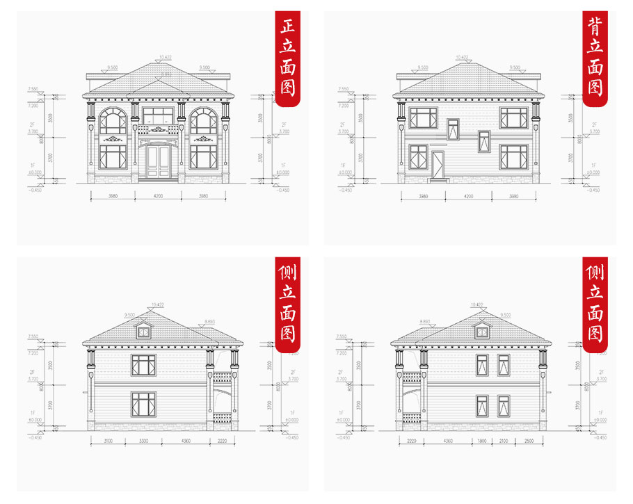 | 建筑圖: | 建筑平面圖:一層平面圖,二層平面圖; 建筑立面圖:東立面圖,西立面圖,南立面圖,北立面圖,剖面圖; 大樣圖:樓梯詳圖,細部大樣,門窗大樣 |