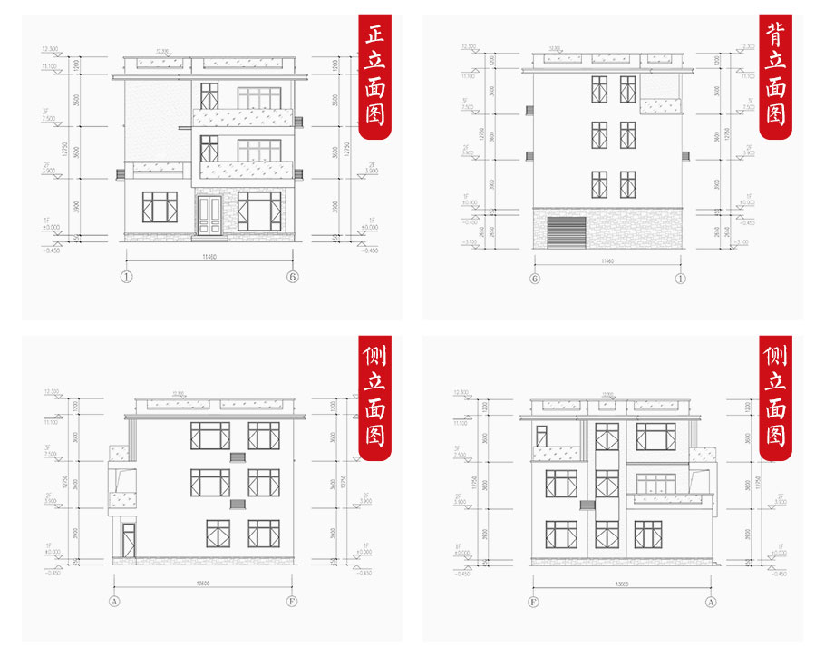 | 建筑圖: | 建筑平面圖:一層平面圖,二層平面圖,三層平面圖; 建筑立面圖:東立面圖,西立面圖,南立面圖,北立面圖,剖面圖; 大樣圖:樓梯詳圖,細部大樣,門窗大樣 |