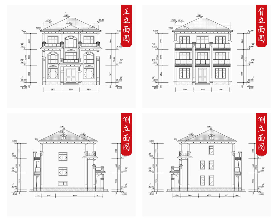 建筑平面圖:一層平面圖,二層平面圖,三層平面圖; 建筑立面圖:東立面圖,西立面圖,南立面圖,北立面圖,剖面圖; 大樣圖:樓梯詳圖,細部大樣,門窗大樣 |