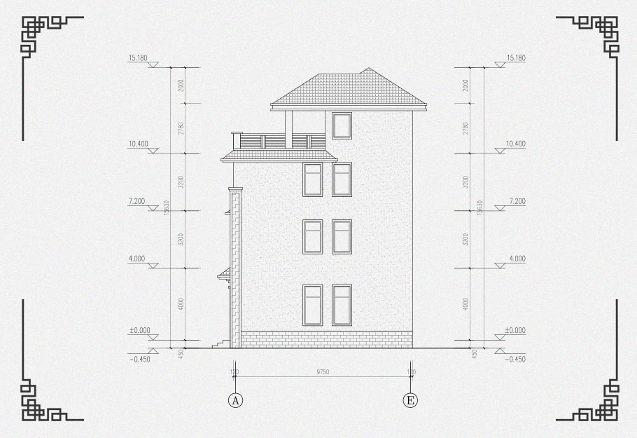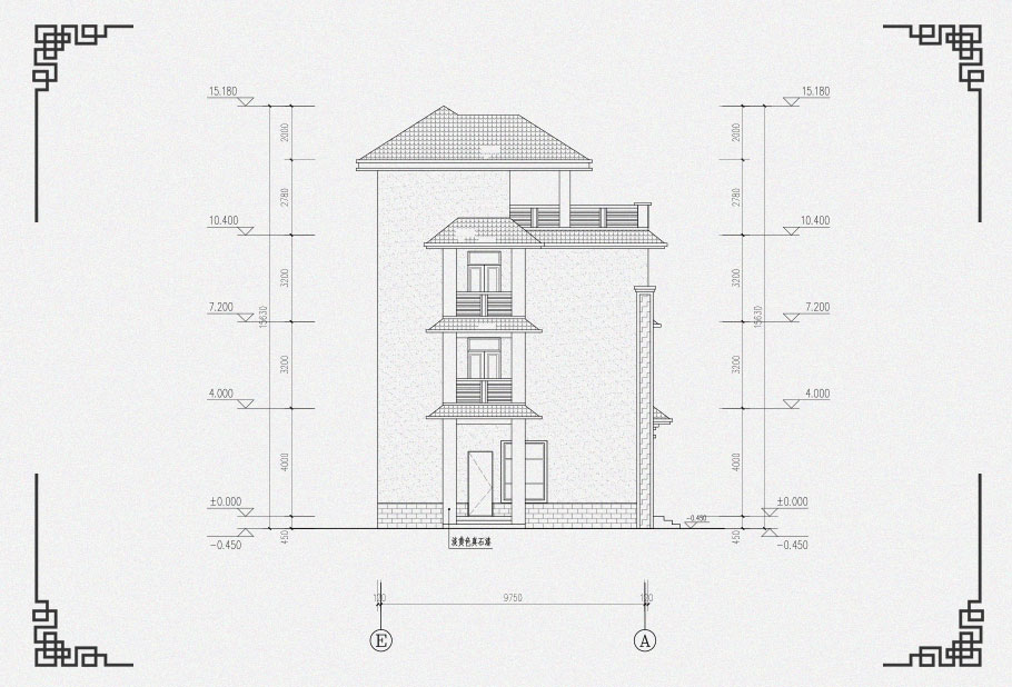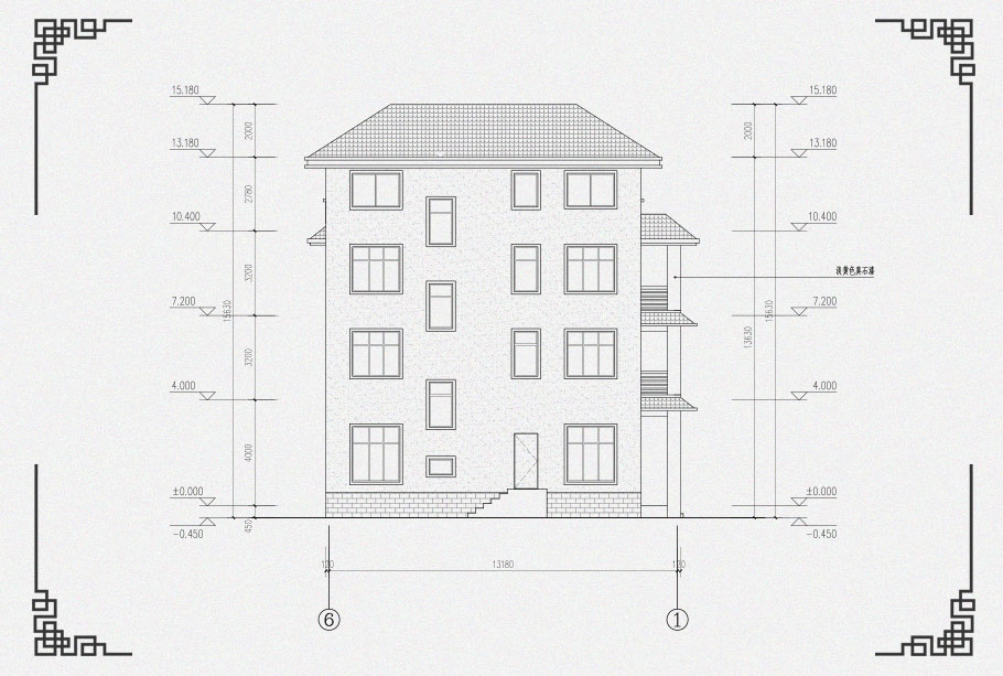 建筑立面圖:東立面圖,西立面圖,南立面圖,北立面圖,剖面圖;