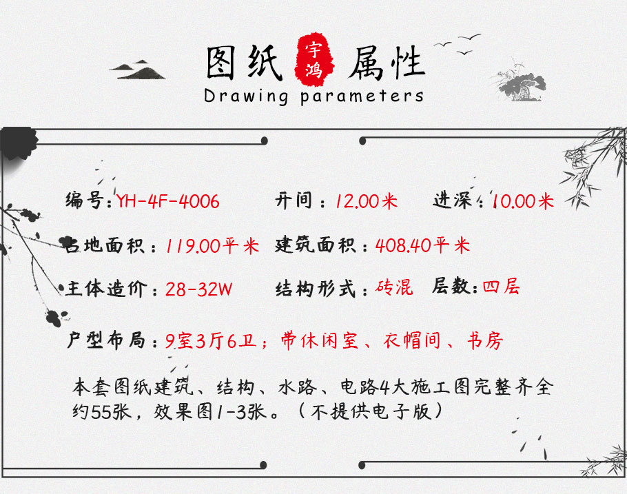 戶型為12x10米四層中式農村別墅設計圖紙,豪華大氣帶堂屋,戶型設計精美闊氣,一二三層設有落地大窗,二三層四層分別有陽臺、大露臺,采光充足,室內敞亮。外立面色彩搭配富有質感,室內功能齊全,空間劃分合理,房間尺寸適宜,空間利用率高。