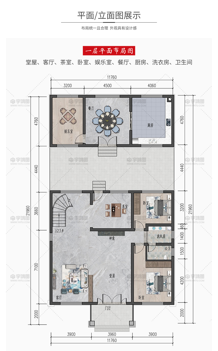 | 開間:11.76米 | 進深:10.76米 | 占地面積:135平方米 | 建筑面積:330平方米 |