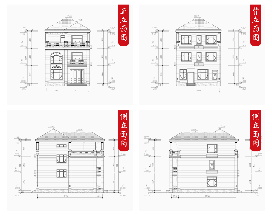 建筑平面圖:一層平面圖,二層平面圖,三層平面圖; 建筑立面圖:東立面圖,西立面圖,南立面圖,北立面圖,剖面圖; 大樣圖:樓梯詳圖,細部大樣,門窗大樣 |