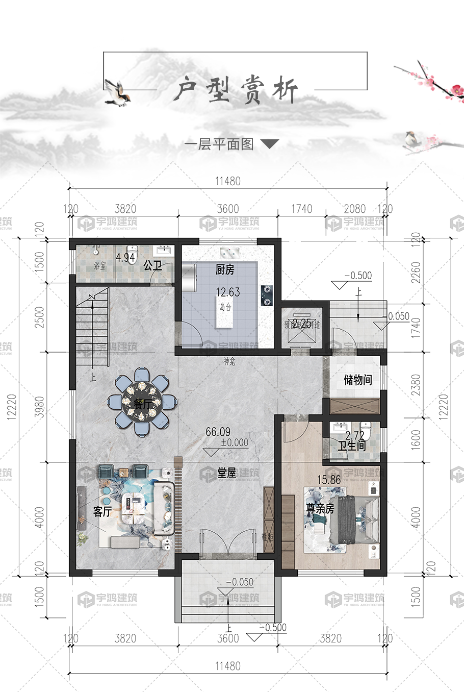| 開間:11.48米 | 進深:12.22米 | 占地面積:131.66平方米 | 建筑面積:571.13平方米 |