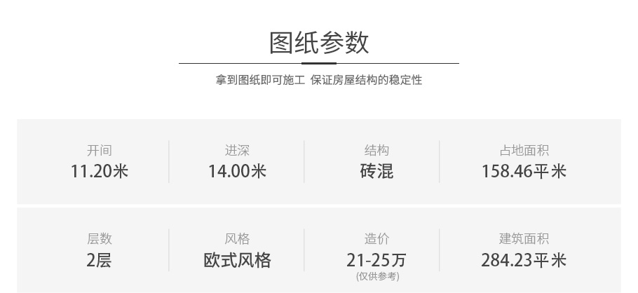 | 開間:11.2米 | 進深:14米 | 占地面積:158.46平方米 | 建筑面積:284.23平方米 |