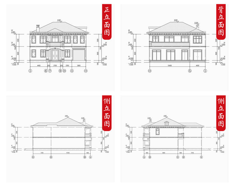 | 建筑圖: | 建筑平面圖:一層平面圖,二層平面圖; 建筑立面圖:東立面圖,西立面圖,南立面圖,北立面圖,剖面圖; 大樣圖:樓梯詳圖,細部大樣,門窗大樣 |