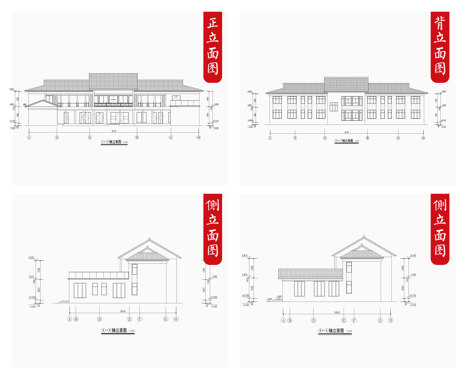 建筑立面圖:東立面圖,西立面圖,南立面圖,北立面圖,剖面圖;