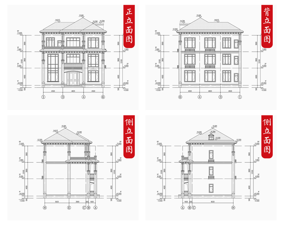 建筑平面圖:一層平面圖,二層平面圖,三層平面圖; 建筑立面圖:東立面圖,西立面圖,南立面圖,北立面圖,剖面圖; 大樣圖:樓梯詳圖,細(xì)部大樣,門窗大樣 |
