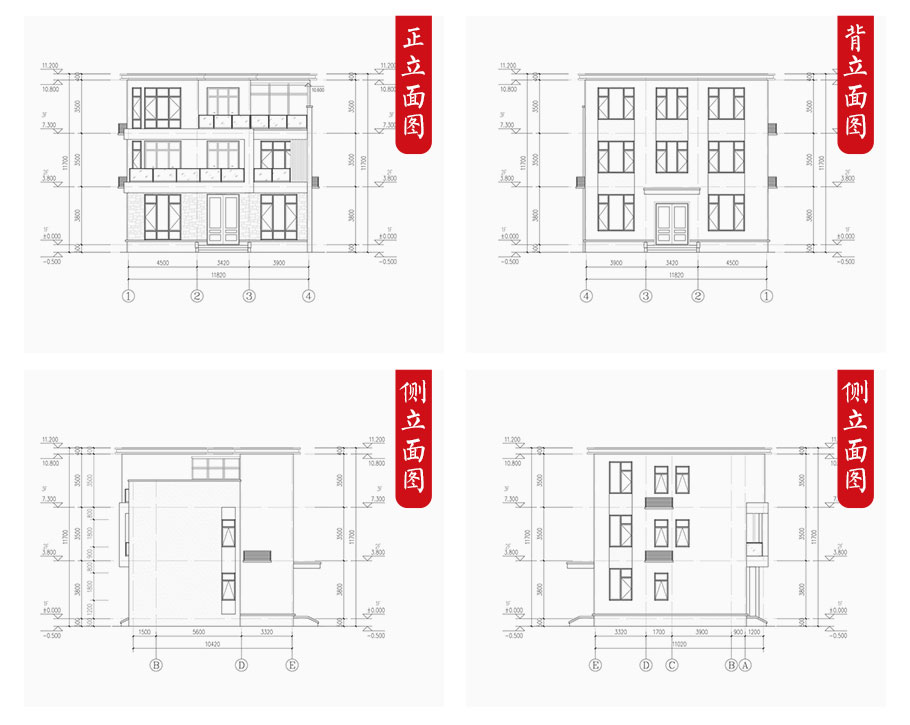 建筑平面圖:一層平面圖,二層平面圖,三層平面圖; 建筑立面圖:東立面圖,西立面圖,南立面圖,北立面圖,剖面圖; 大樣圖:樓梯詳圖,細部大樣,門窗大樣 |