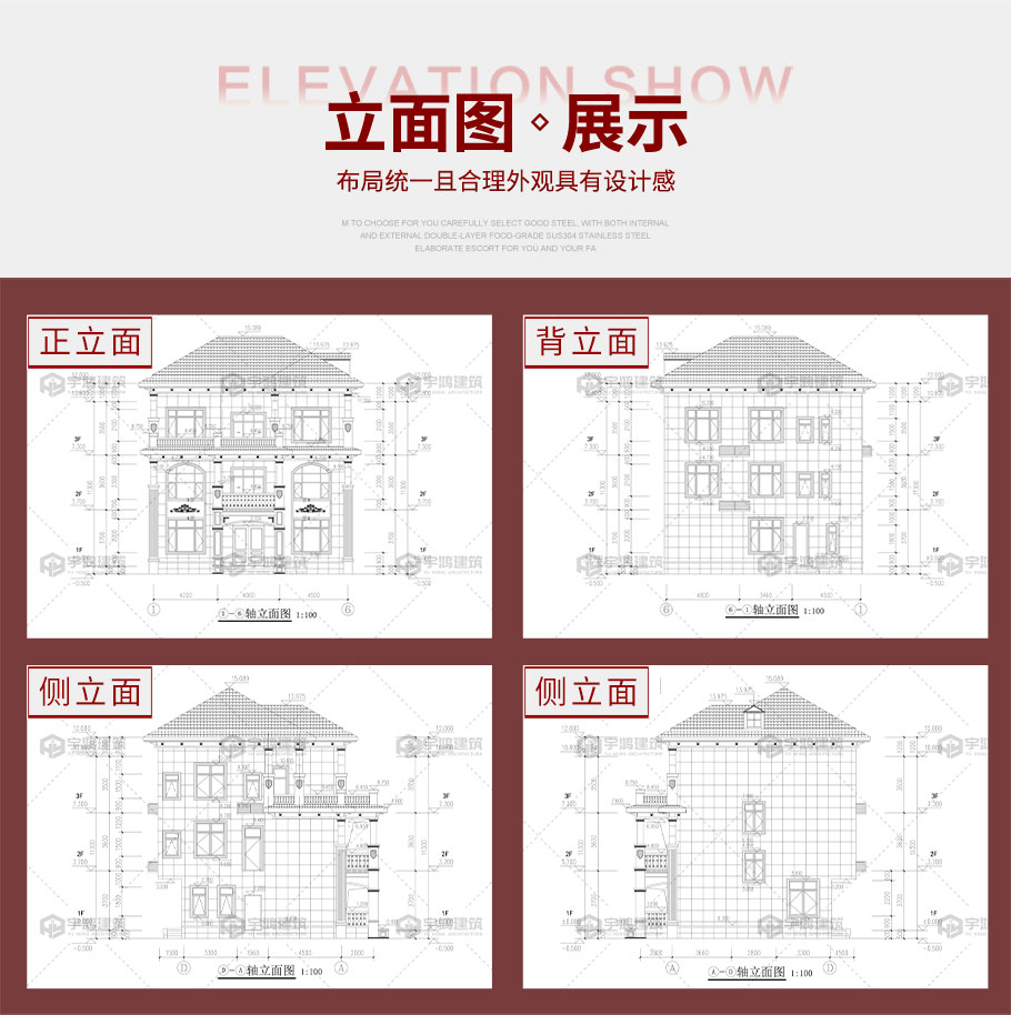 建筑平面圖:一層平面圖,二層平面圖,三層平面圖; 建筑立面圖:東立面圖,西立面圖,南立面圖,北立面圖,剖面圖; 大樣圖:樓梯詳圖,細(xì)部大樣,門窗大樣 |