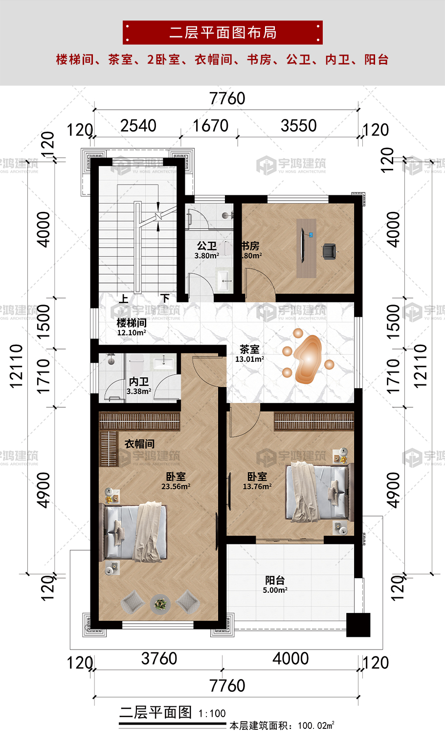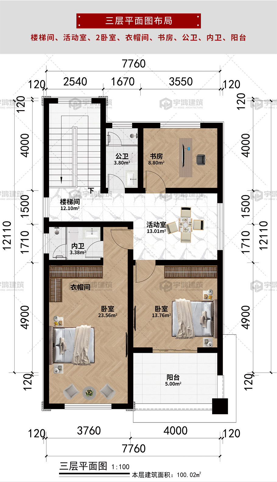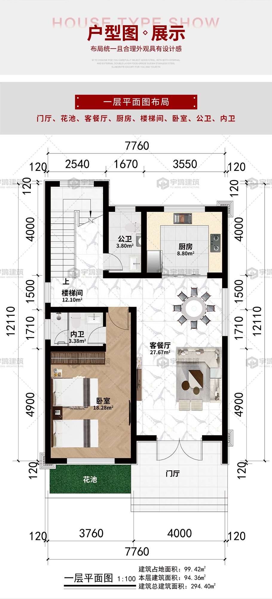 | 開間:7.76米 | 進深:12.11米 | 占地面積:99.42平方米 | 建筑面積:294.4平方米 |
