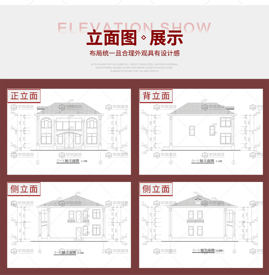 | 建筑圖: | 建筑平面圖:一層平面圖,二層平面圖; 建筑立面圖:東立面圖,西立面圖,南立面圖,北立面圖,剖面圖; 大樣圖:樓梯詳圖,細部大樣,門窗大樣 |
