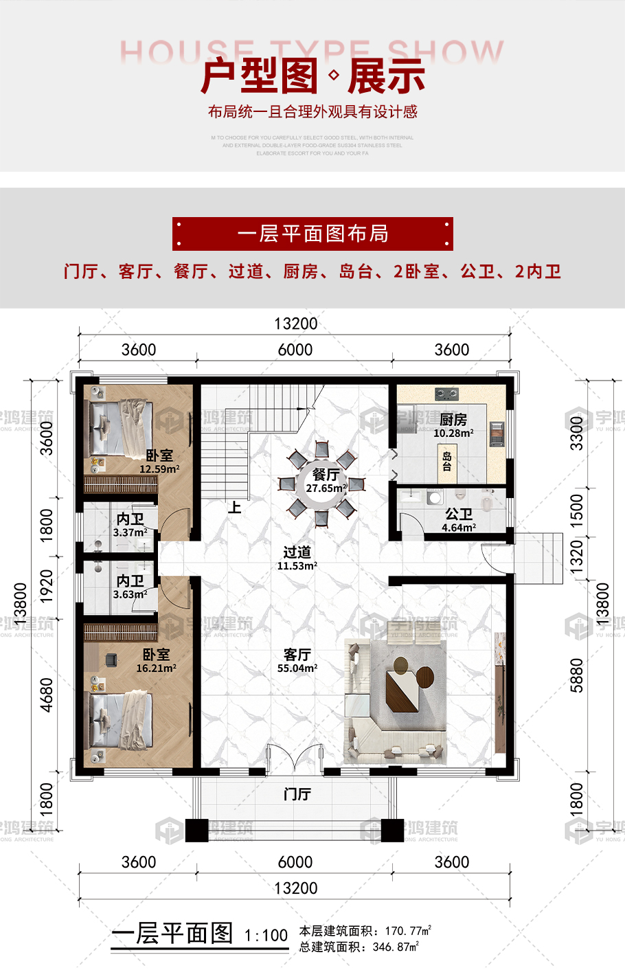 | 開間:13.2米 | 進深:13.8米 | 占地面積:177.5平方米 | 建筑面積:346.87平方米 |