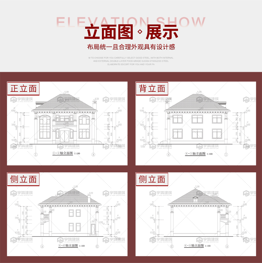 | 建筑圖: | 建筑平面圖:一層平面圖,二層平面圖; 建筑立面圖:東立面圖,西立面圖,南立面圖,北立面圖,剖面圖; 大樣圖:樓梯詳圖,細部大樣,門窗大樣 |