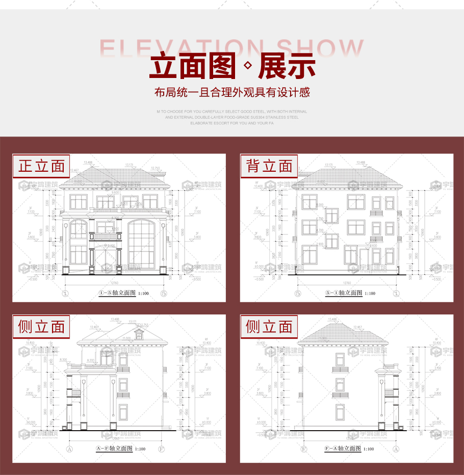建筑平面圖:一層平面圖,二層平面圖,三層平面圖; 建筑立面圖:東立面圖,西立面圖,南立面圖,北立面圖,剖面圖; 大樣圖:樓梯詳圖,細部大樣,門窗大樣 |