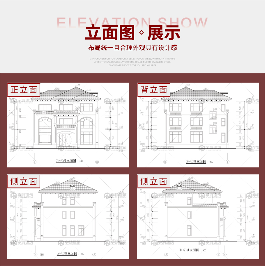 建筑平面圖:一層平面圖,二層平面圖,三層平面圖; 建筑立面圖:東立面圖,西立面圖,南立面圖,北立面圖,剖面圖; 大樣圖:樓梯詳圖,細部大樣,門窗大樣 |