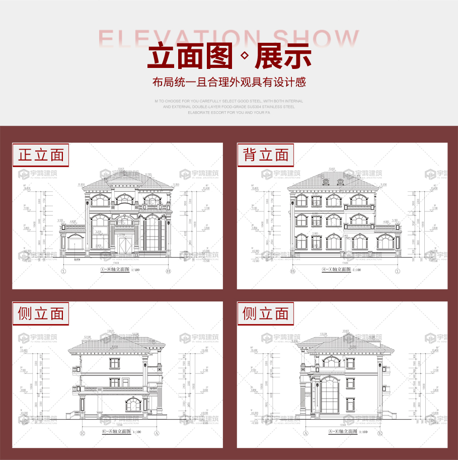 建筑平面圖:一層平面圖,二層平面圖,三層平面圖; 建筑立面圖:東立面圖,西立面圖,南立面圖,北立面圖,剖面圖; 大樣圖:樓梯詳圖,細部大樣,門窗大樣 |