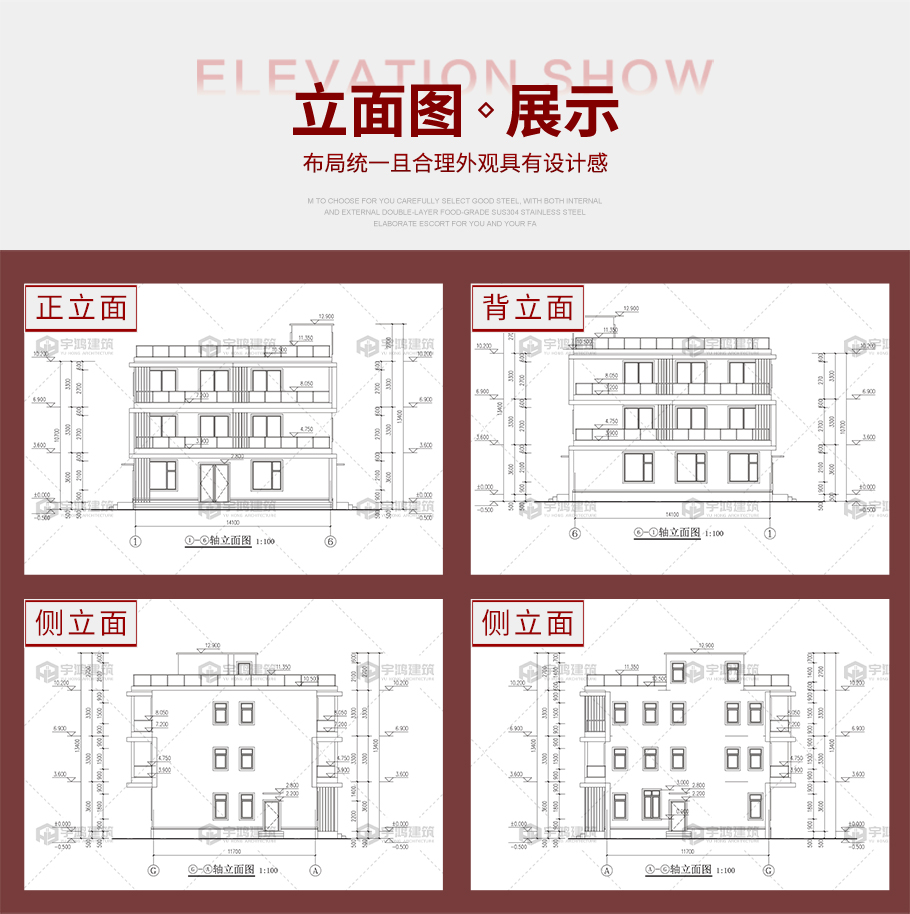 建筑平面圖:一層平面圖,二層平面圖,三層平面圖; 建筑立面圖:東立面圖,西立面圖,南立面圖,北立面圖,剖面圖; 大樣圖:樓梯詳圖,細部大樣,門窗大樣 |