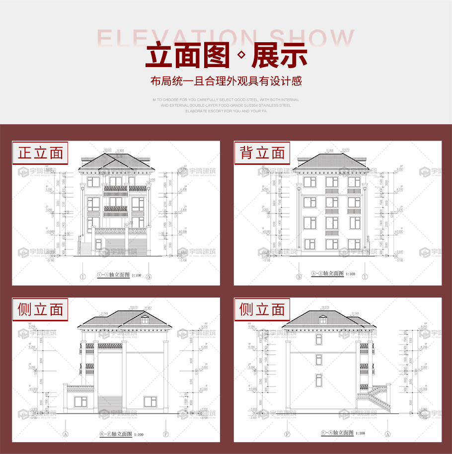 建筑平面圖:一層平面圖,二層平面圖,三層平面圖,架空層平面圖; 建筑立面圖:東立面圖,西立面圖,南立面圖,北立面圖,剖面圖; 大樣圖:樓梯詳圖,細部大樣,門窗大樣 |