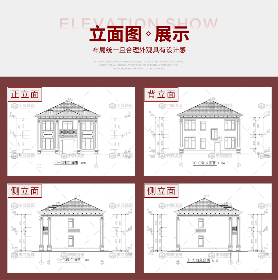建筑平面圖:一層平面圖,二層平面圖; 建筑立面圖:東立面圖,西立面圖,南立面圖,北立面圖,剖面圖; 大樣圖:樓梯詳圖,細部大樣,門窗大樣 |