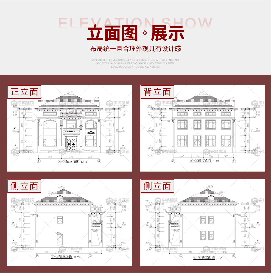 建筑平面圖:一層平面圖,二層平面圖; 建筑立面圖:東立面圖,西立面圖,南立面圖,北立面圖,剖面圖; 大樣圖:樓梯詳圖,細(xì)部大樣,門窗大樣 |