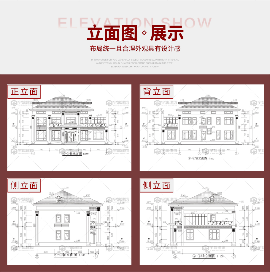建筑平面圖:一層平面圖,二層平面圖; 建筑立面圖:東立面圖,西立面圖,南立面圖,北立面圖,剖面圖; 大樣圖:樓梯詳圖,細部大樣,門窗大樣 |
