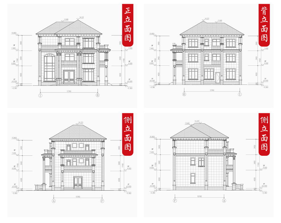 建筑立面圖:東立面圖,西立面圖,南立面圖,北立面圖,剖面圖;